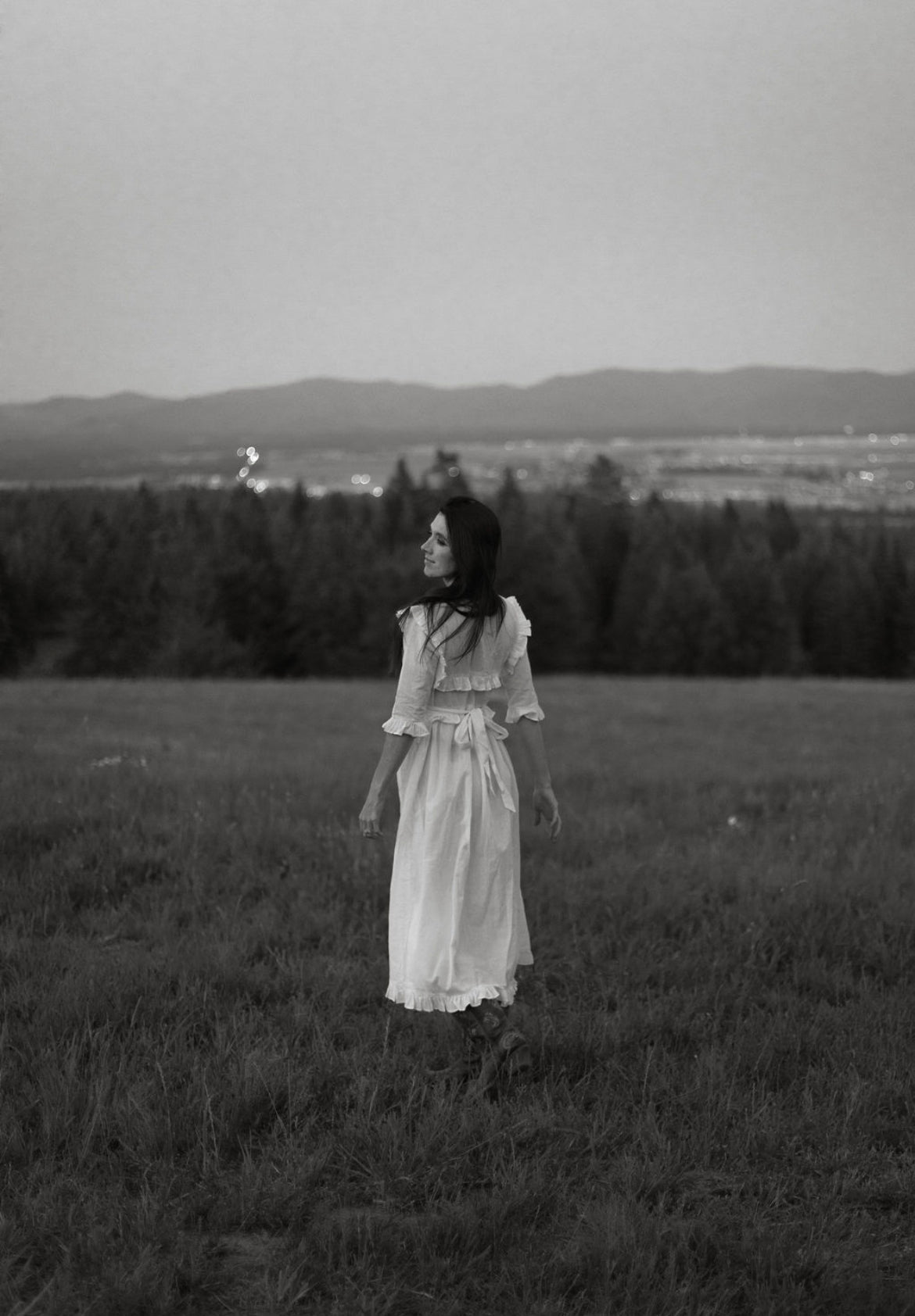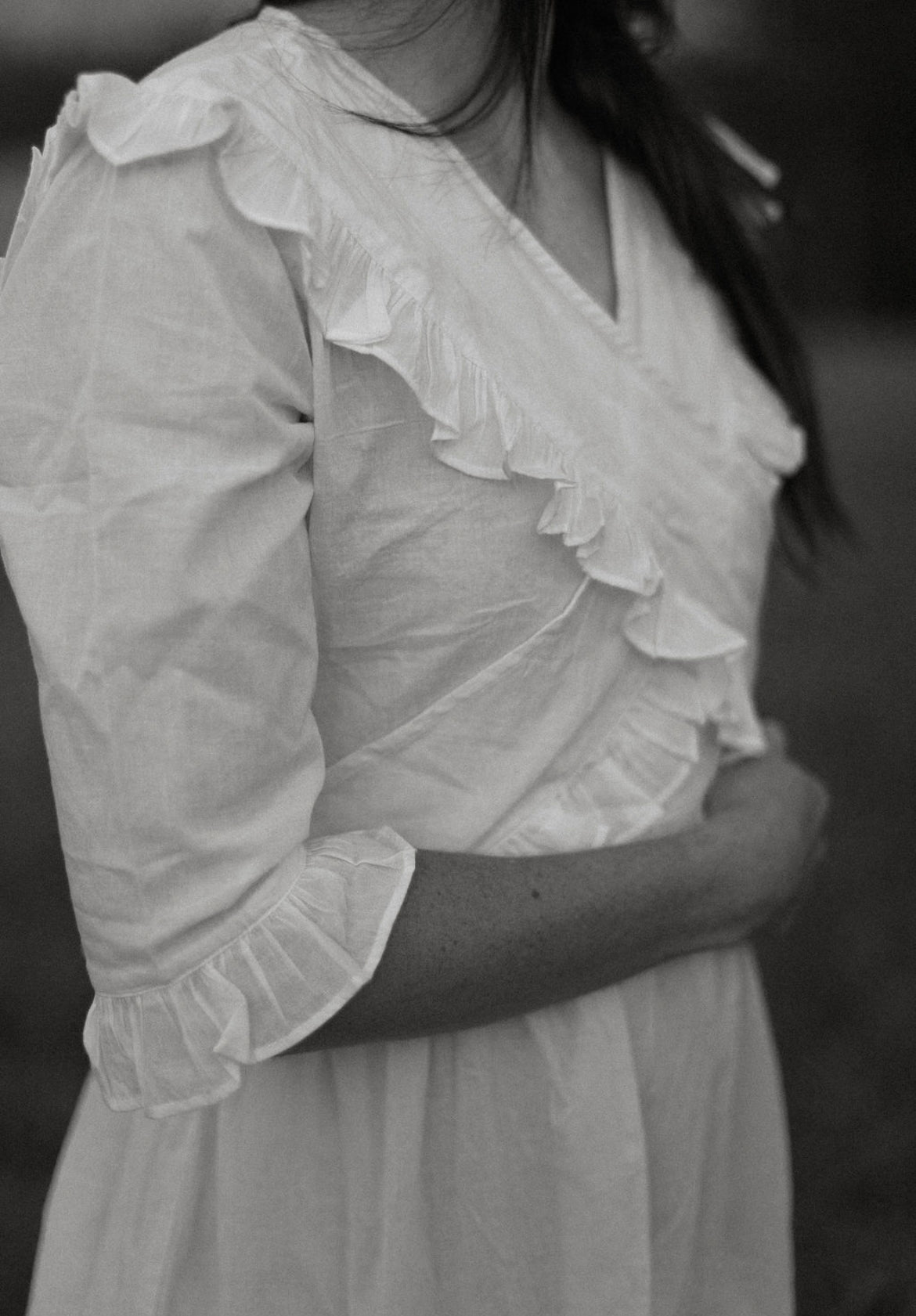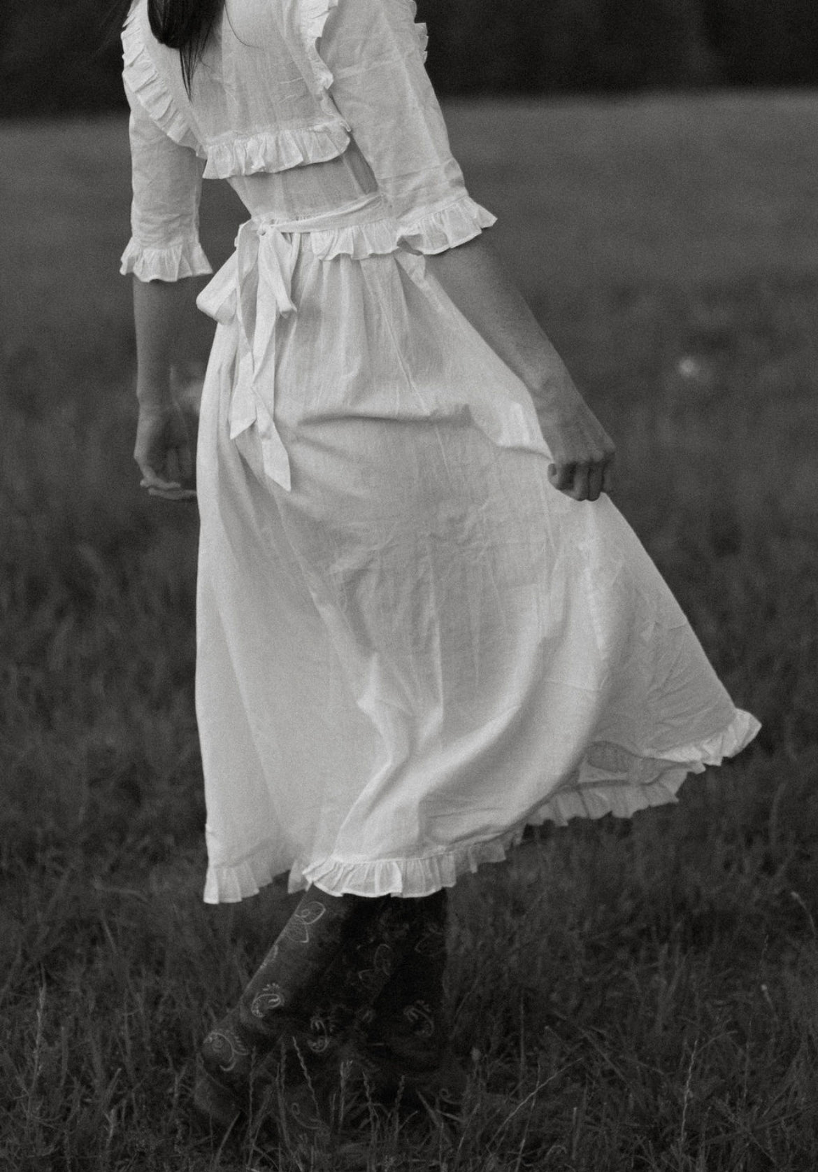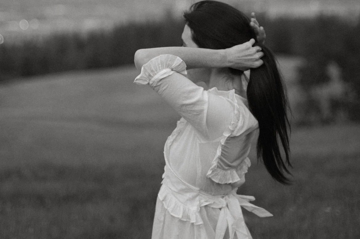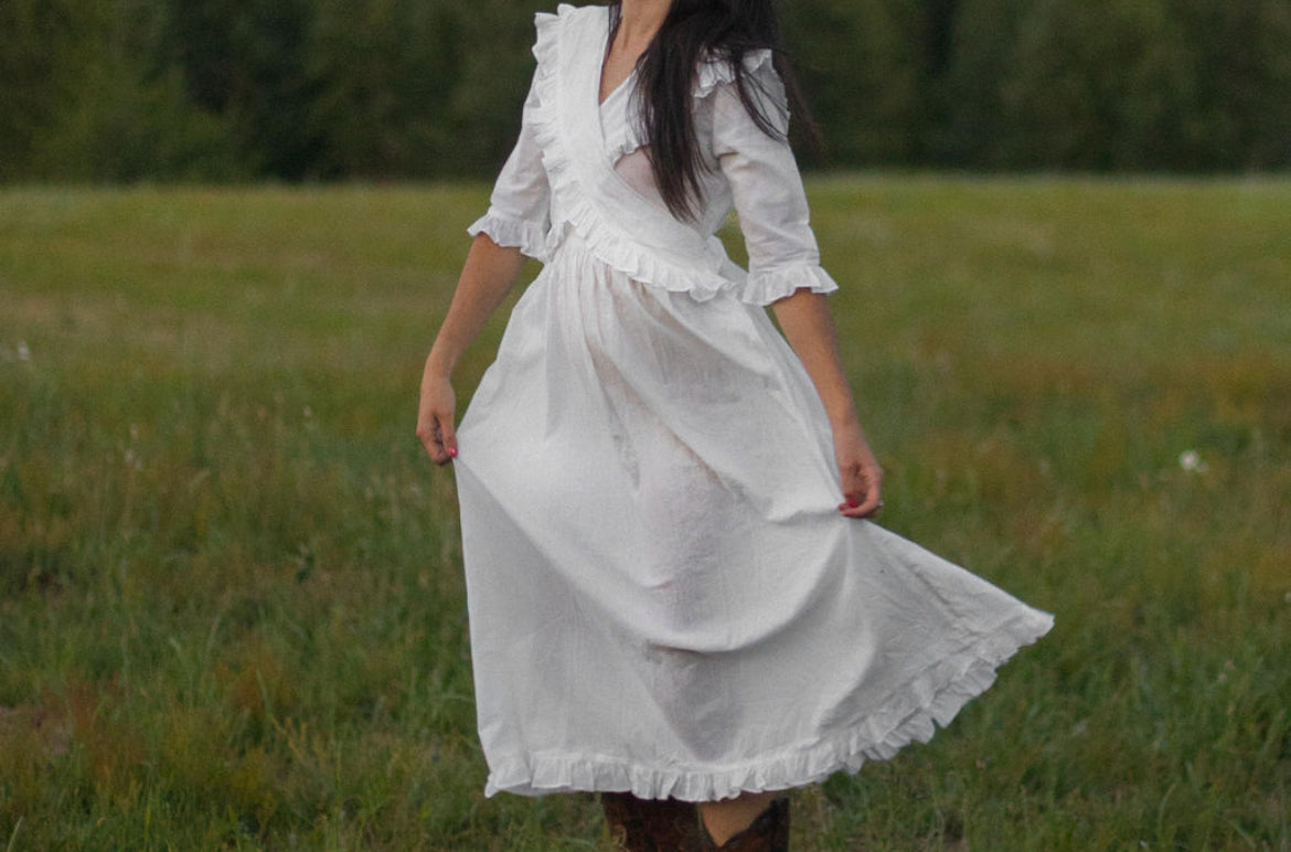 Eleanor is adorned with a wrap-style ruffled bodice that ties in the back, along with dainty ruffle trim on both sleeves and hemline. She is crafted out of lightweight 100% cotton and fully lined in the skirt. Available in pure milk white as well as a soft, buttery yellow Pearly Everlasting floral.